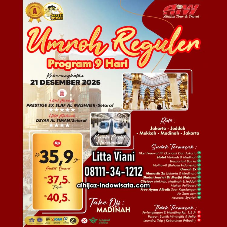 UMROH REGULER KERETA CEPAT HARGA MULAI 31,3 JUTA 9 HARI JANUARI 2026